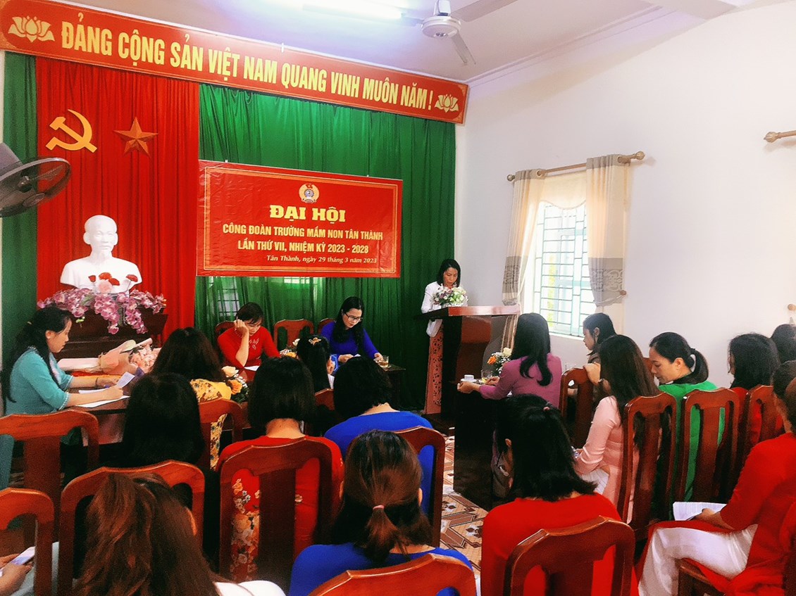 Ngày 30 tháng 3 năm 2023 trường MN Tân Thành đã tổ chức Đại hội công đoàn nhiệm kỳ 2023-2028. Đại hội đã vinh dự đón đồng chí Trần Thị Hằng PCT LĐLĐ Quận Dương Kinh về dự và phát biểu chỉ đạo đại hội. Đại hội đã bầu ra BCH mới gồm các đồng chí: Bùi Thị Lý, Nguyễn Thị Hương, Nguyễn Thị Hạnh. Sau đây là một số hình ảnh nổi bật.