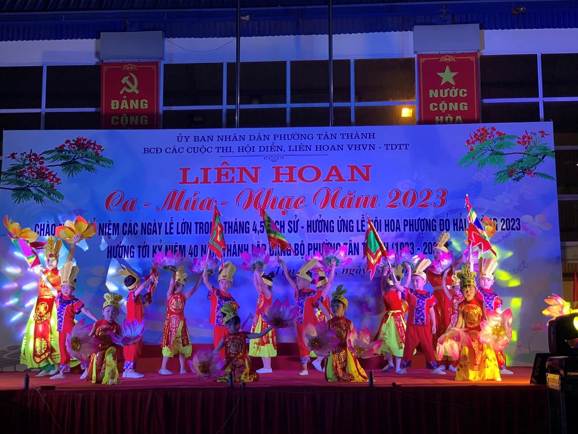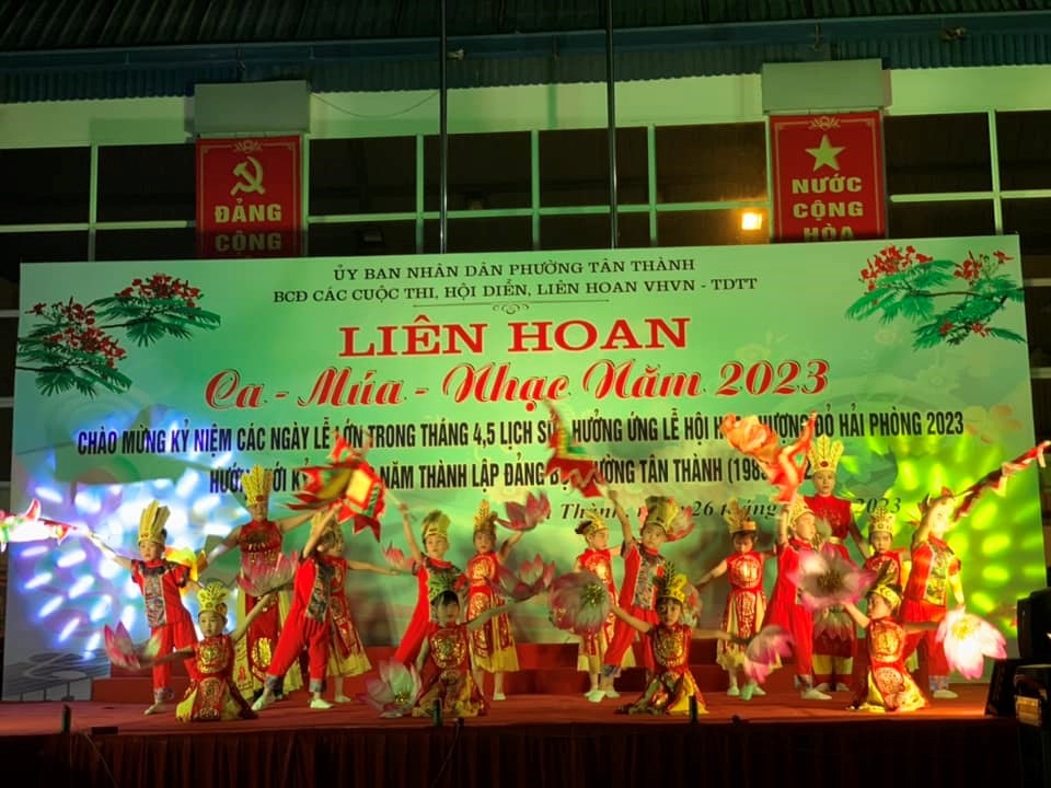 Chào mừng kỷ niệm các ngày lễ lớn trong tháng 4,5 lịch sử - Hưởng ứng lễ hội Hoa phượng đỏ Hải Phòng 2023 - Hướng tới kỷ niệm 40 năm ngày thành lập Đảng bộ phường Tân Thành. Ngày 26/4/2023 phường Tân Thành đã tổ chức Liên hoan Ca -Múa - Nhạc với sự tham gia của 6 đội đến từ các tổ dân phố và các trường học trên địa bàn Phường. Tại liên hoan này các cô giáo, phụ huynh, và các cháu học sinh truwongf MN Tân Thành đã đạt giải nhì với các tiết mục múa, hát đặc sắc: Dòng máu Lạc Hồng, Việt Nam gấm hoa, Quê tôi. Sau đây là một số hình ảnh: